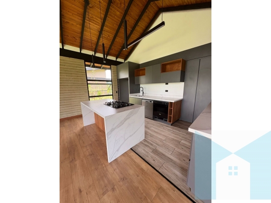 La zona social integra sala, comedor y un encantador deck, ideal para compartir momentos especiales rodeado de naturaleza. La cocina es amplia y completamente equipada, complementada con alacena independiente y un cuarto de ropas de gran tamaño.